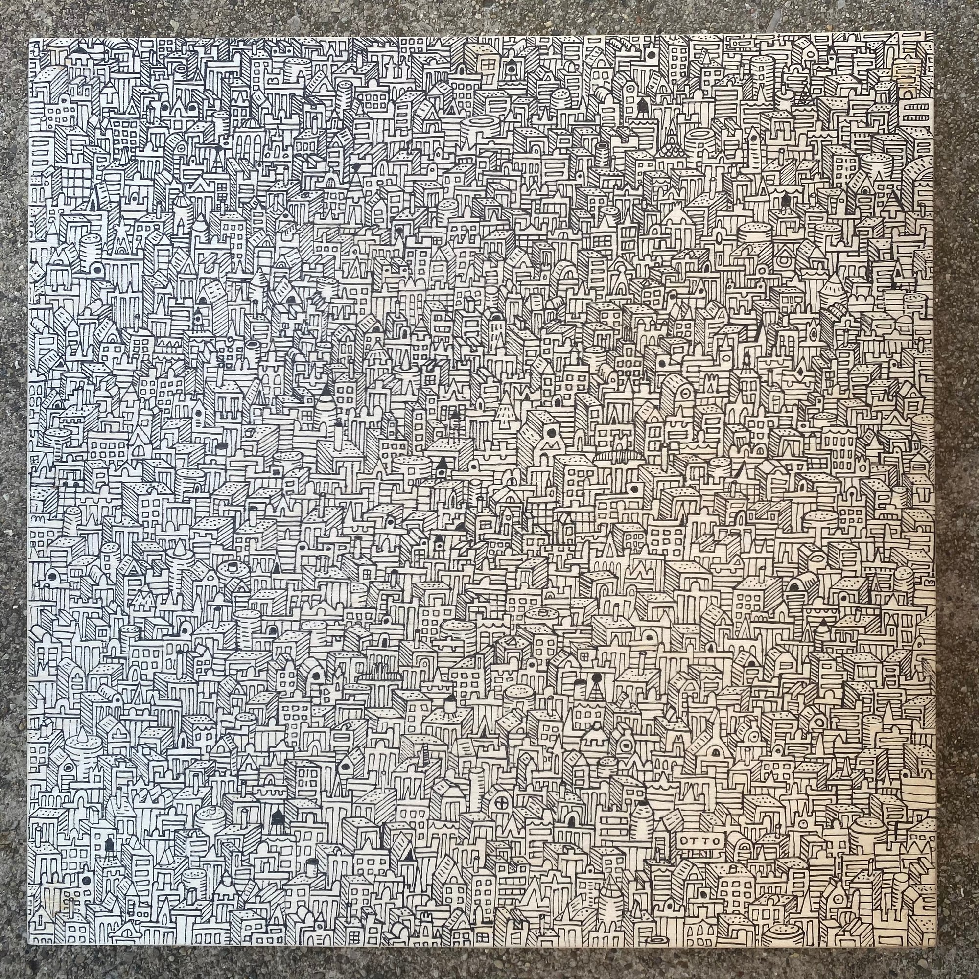 12”x12” ink on wood panel. Lots of buildings in this one. If I don’t sell it right away I’m going to add color. If it sells in this state, I will add matte finish to it before I ship it. Lots of hours in this one. Ships free.