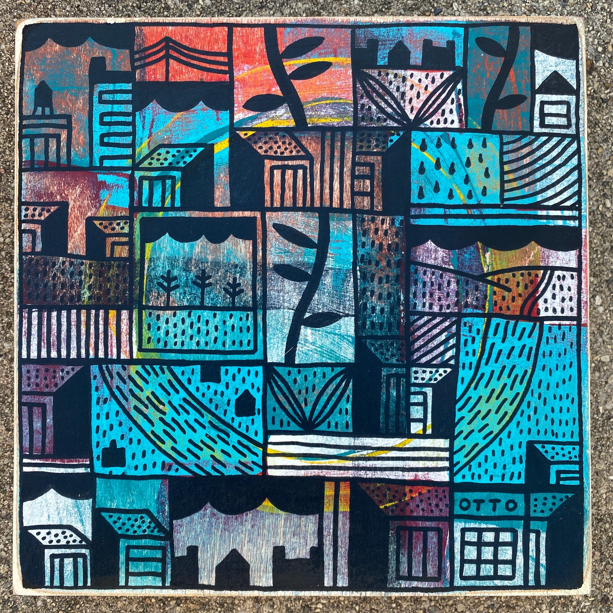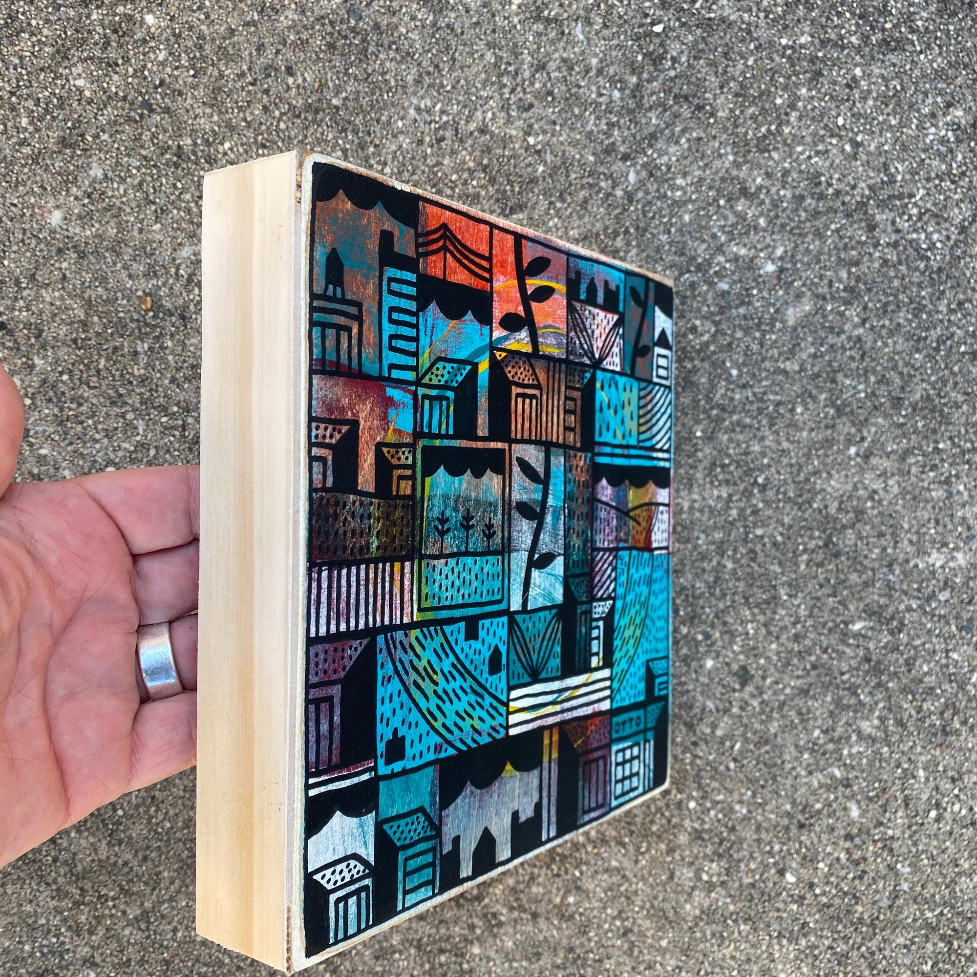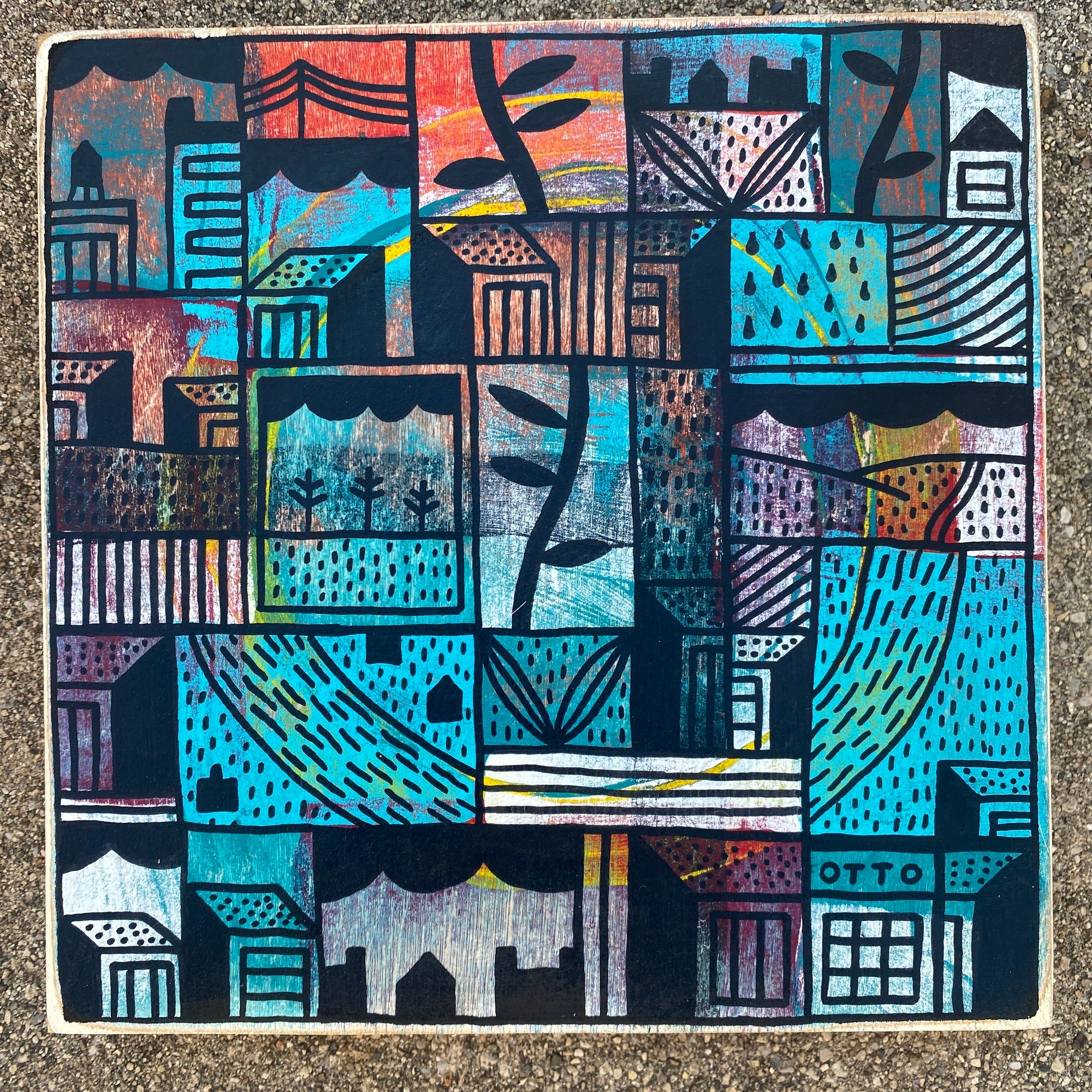 8"x8" wood panel. Acrylic layers sanded and black acrylic ink on wood. Satin finish. Ships free.