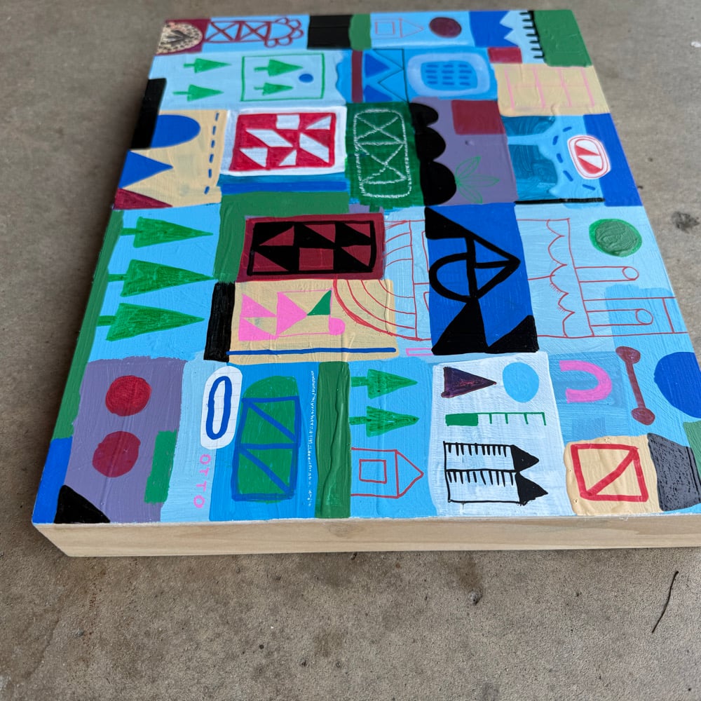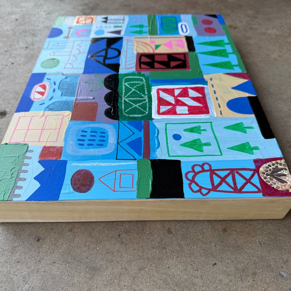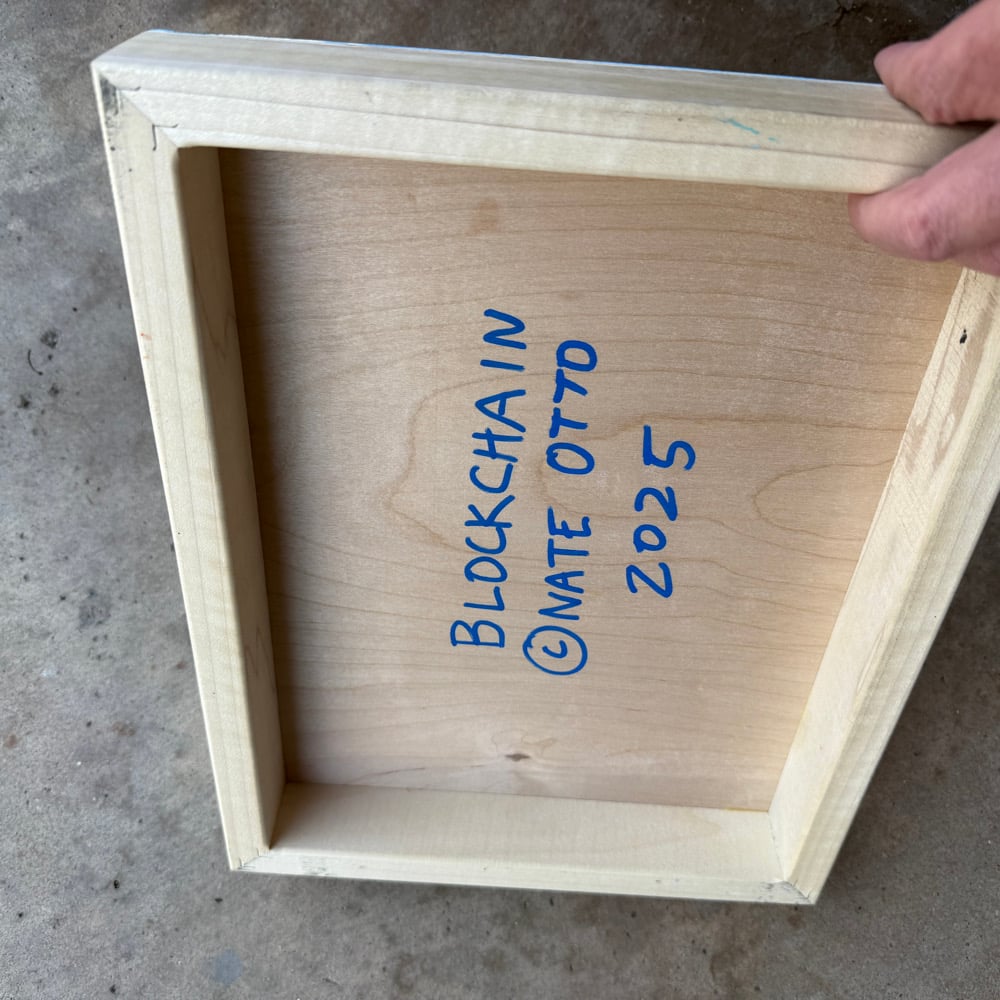 Blockchain, a 11”x14” wood panel. Acrylic, acrylic ink, collage, ink, and china marker on wood. Ready to hang. Ships free.