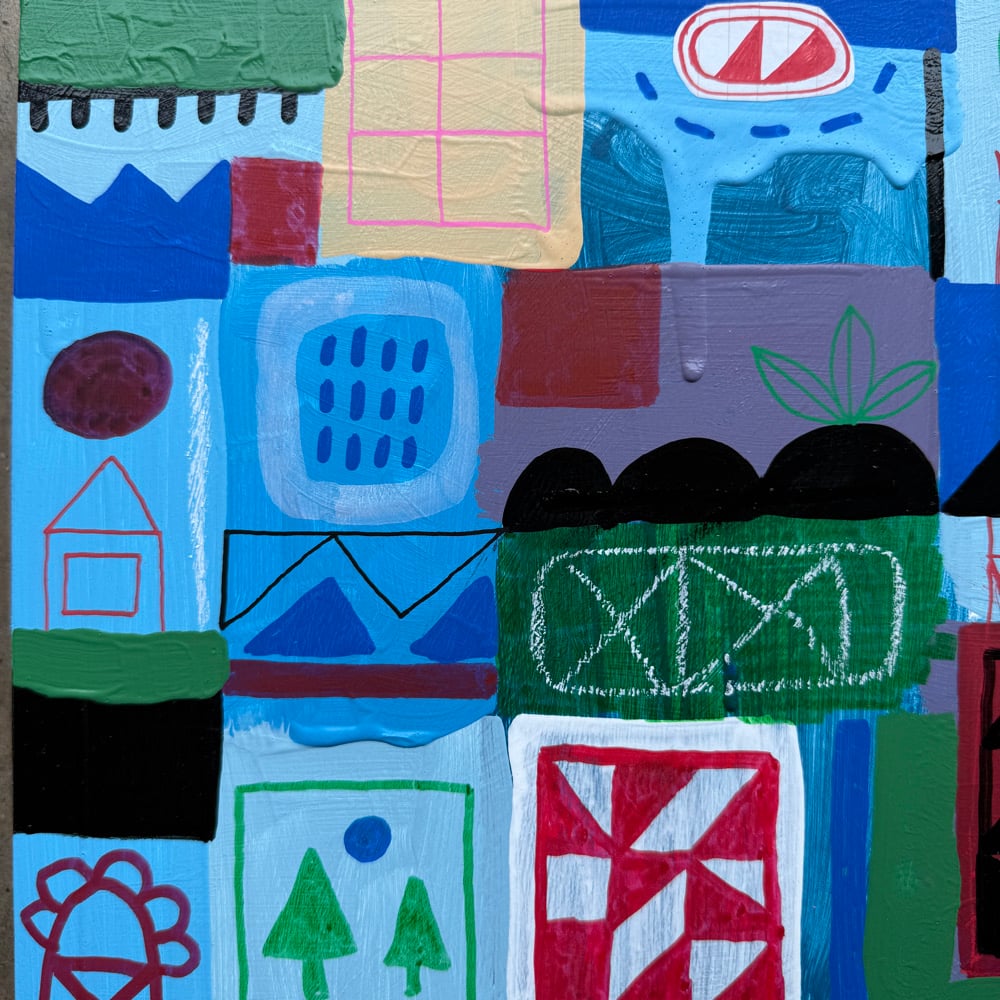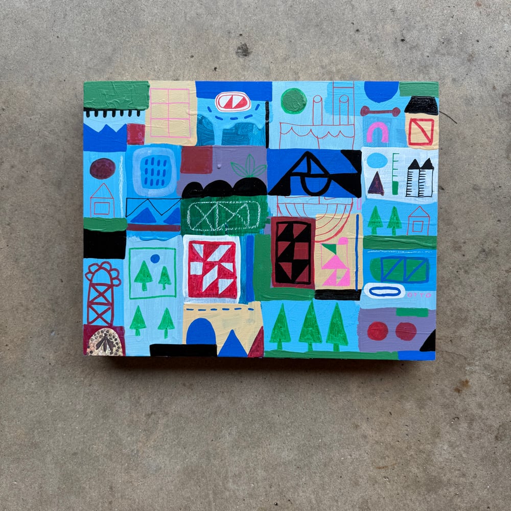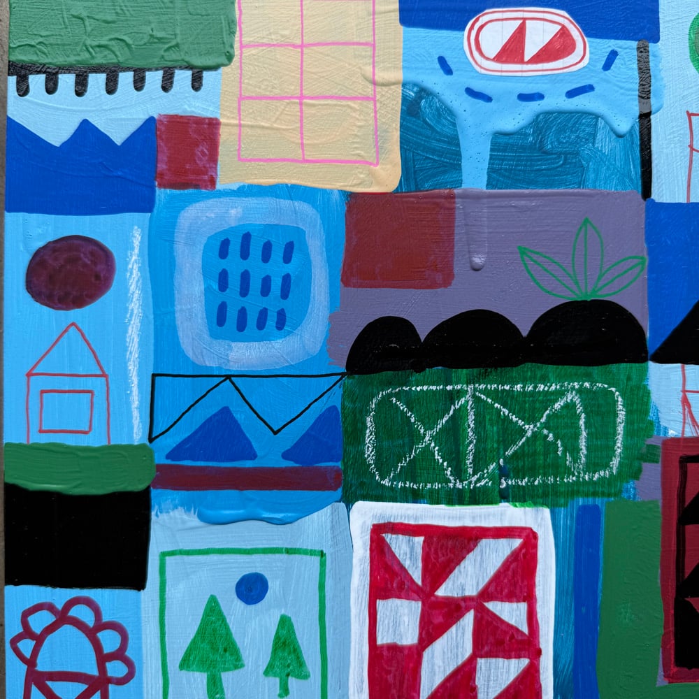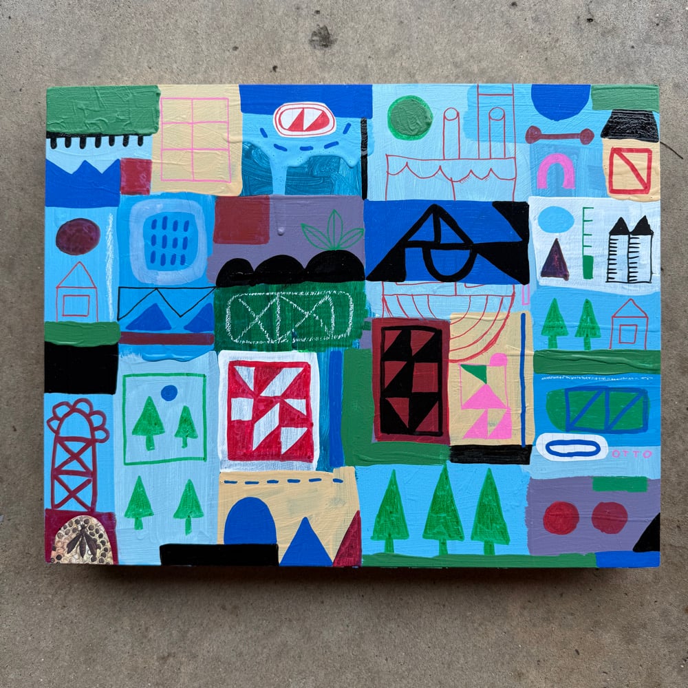 Blockchain, a 11”x14” wood panel. Acrylic, acrylic ink, collage, ink, and china marker on wood. Ready to hang. Ships free.