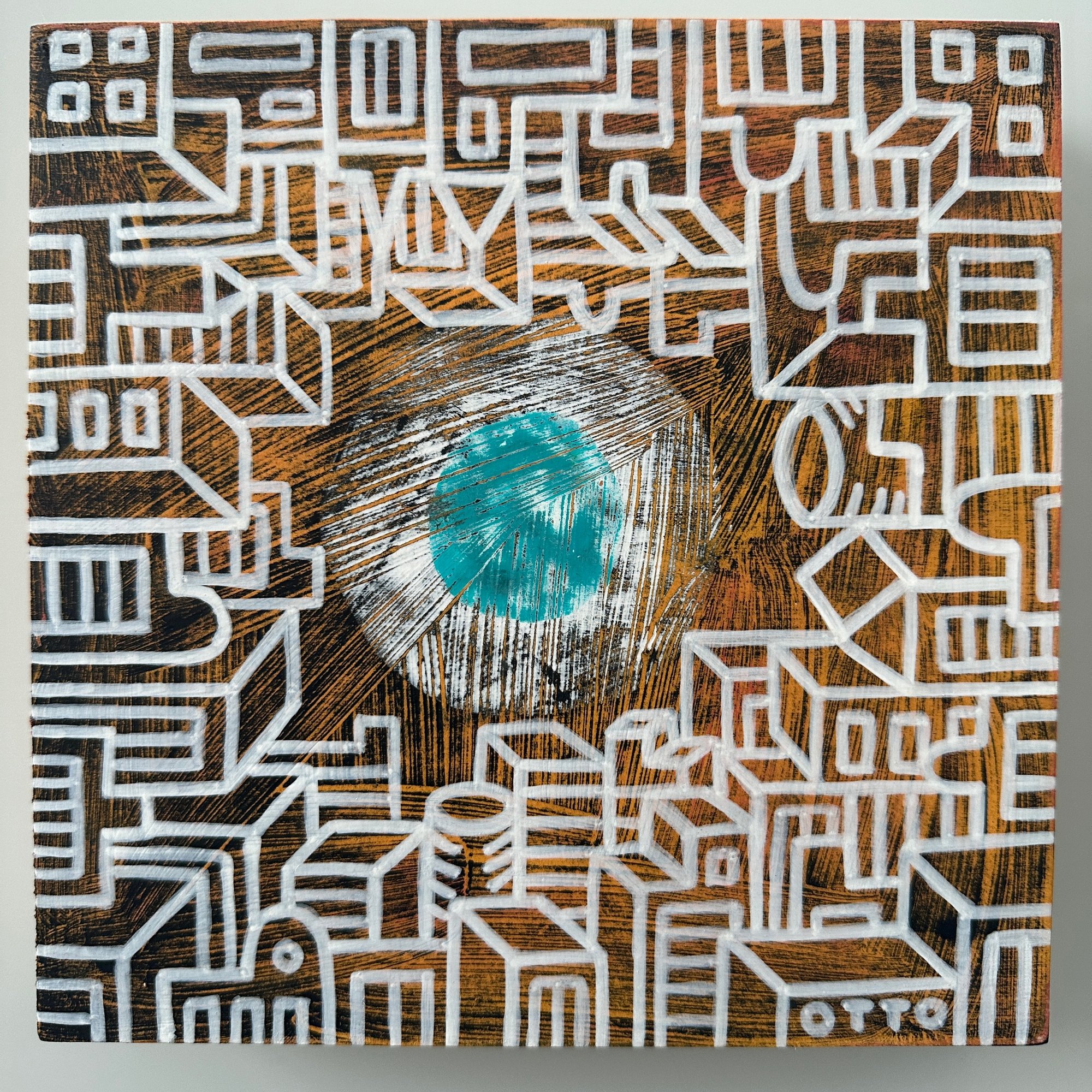 8"x8" wood panel. Acrylic layers sanded and acrylic ink white lines. Matte finish. Ships free.