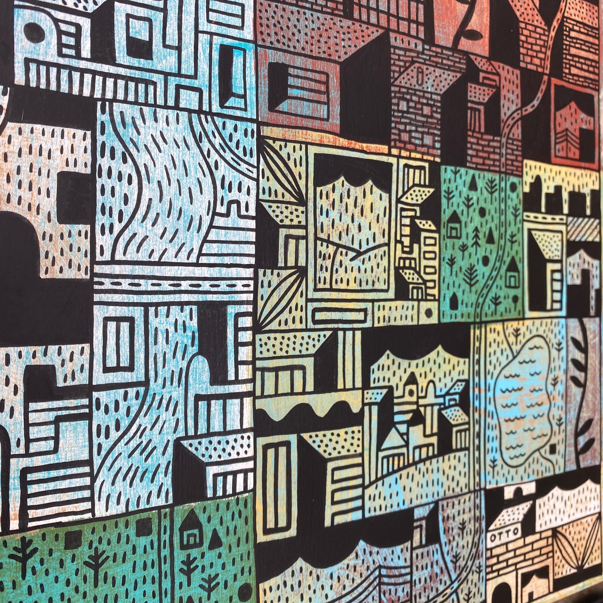 12"x12" custom wood panel. Acrylic and acrylic ink on wood with matte finish. My wife likes it a lot. Ships free.