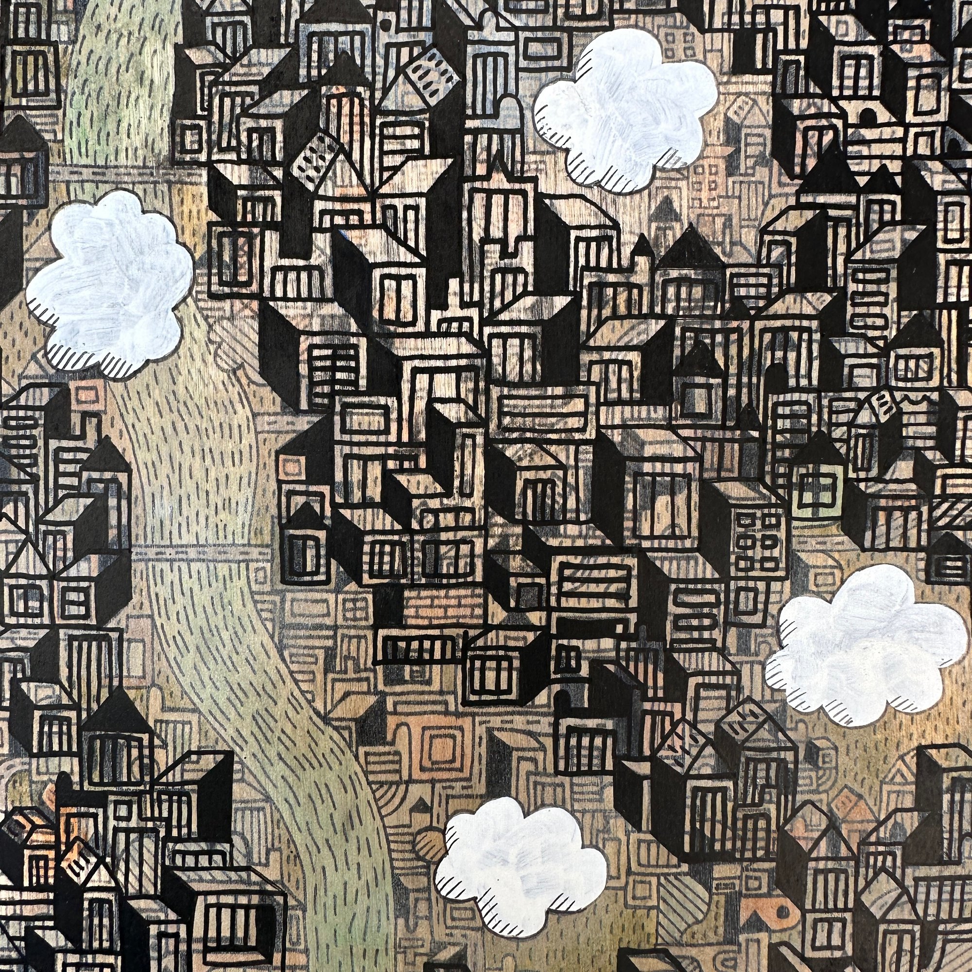 12"x12" custom made wood panel. Ink on wood followed by UV protectant and matte finish, followed by sanding of the surface, followed by acrylic on the clouds and acrylic ink on top. Too many hours. Ships free.