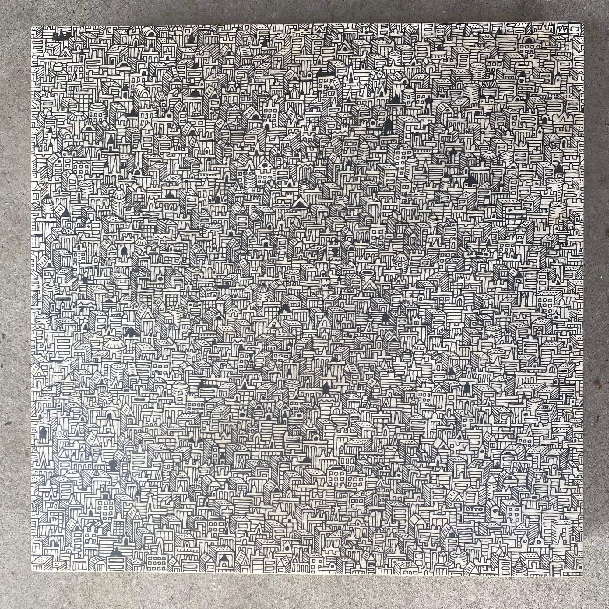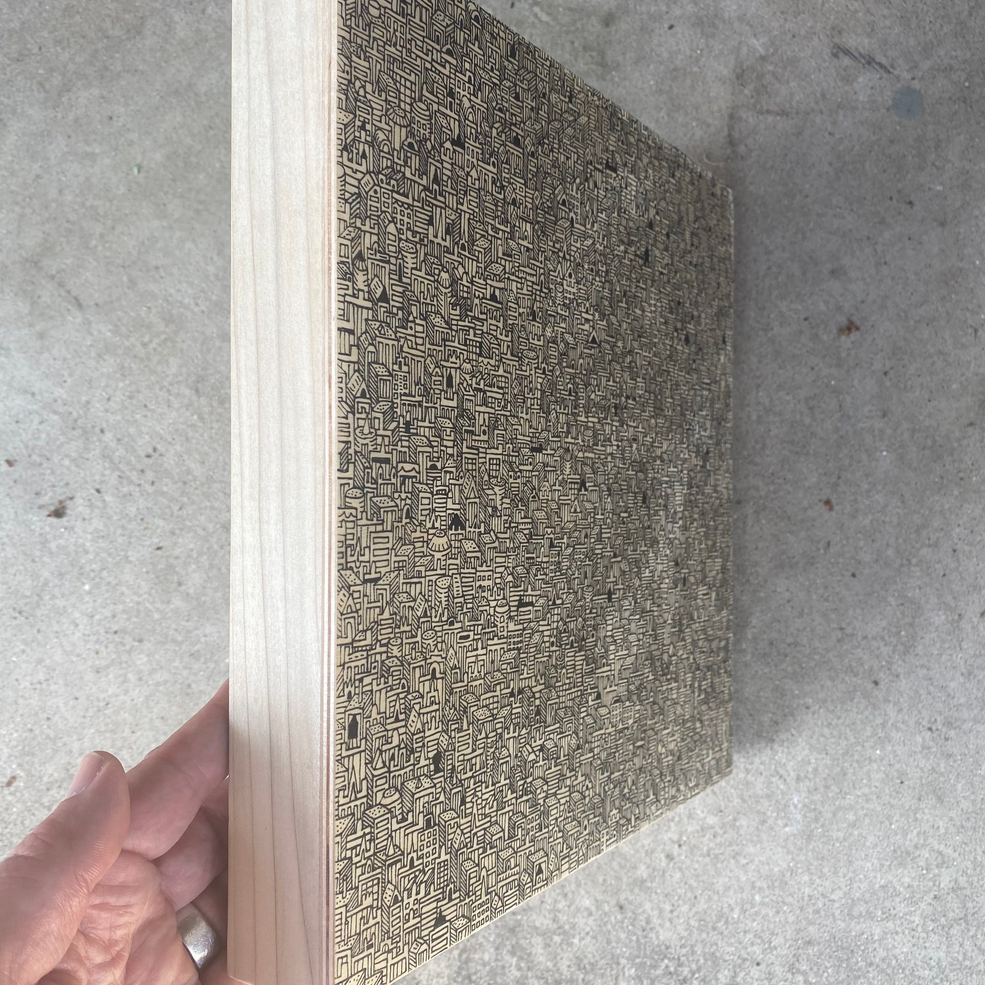 12”x12” ink on custom made wood panel. A dense cityscape on wood with ink. Matte finish. Ships free.