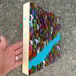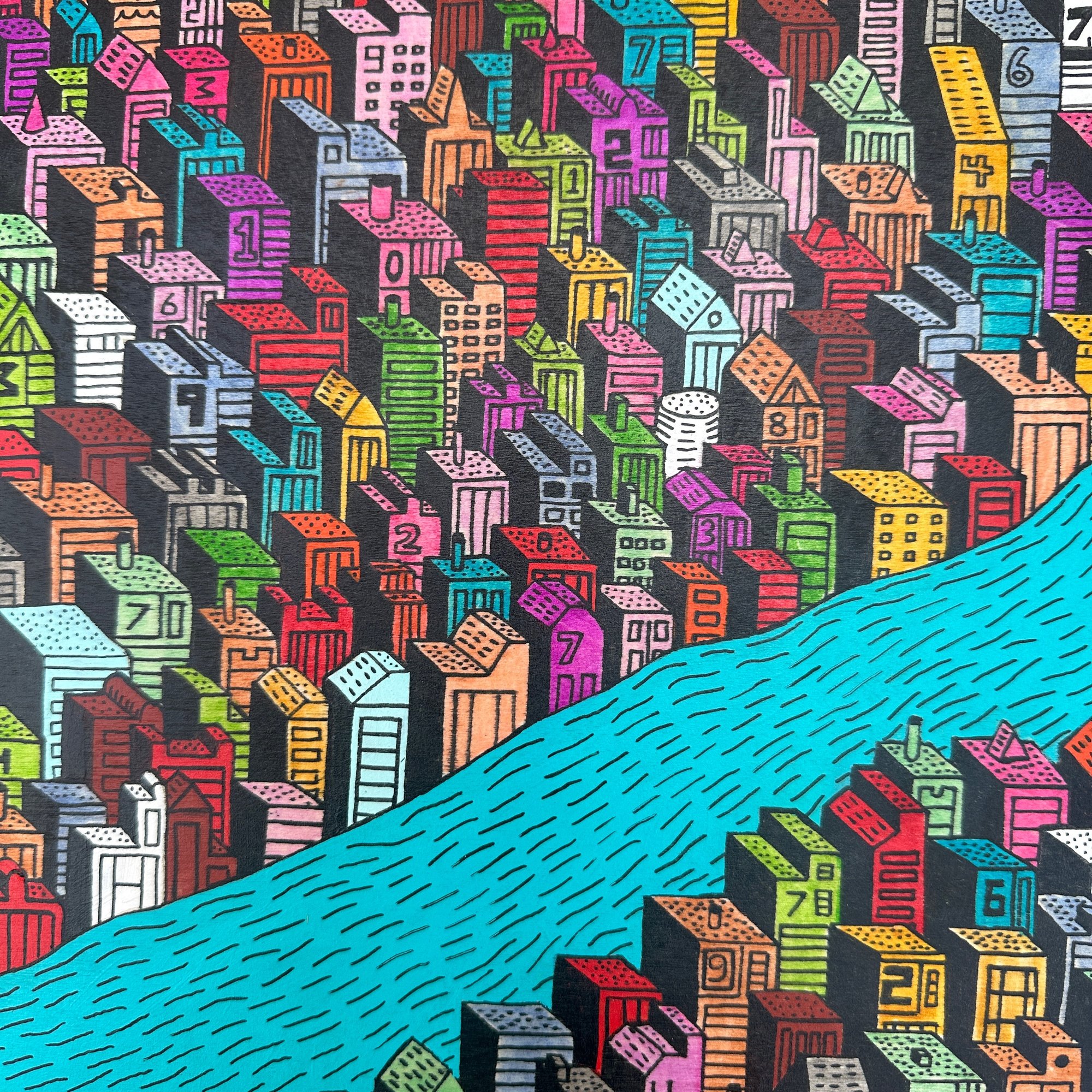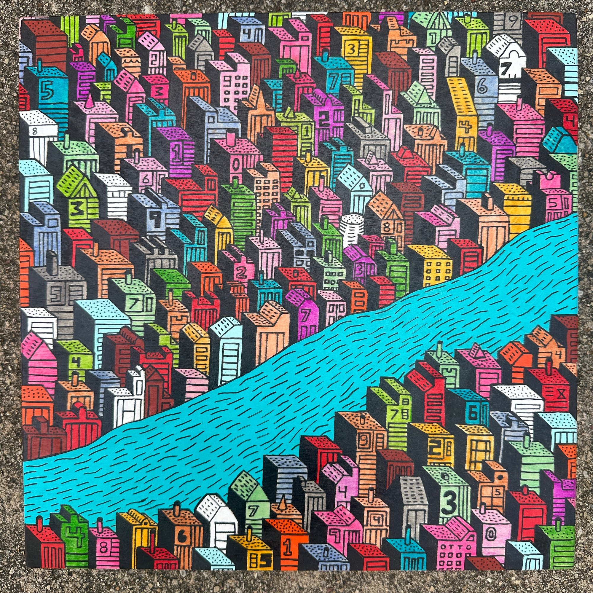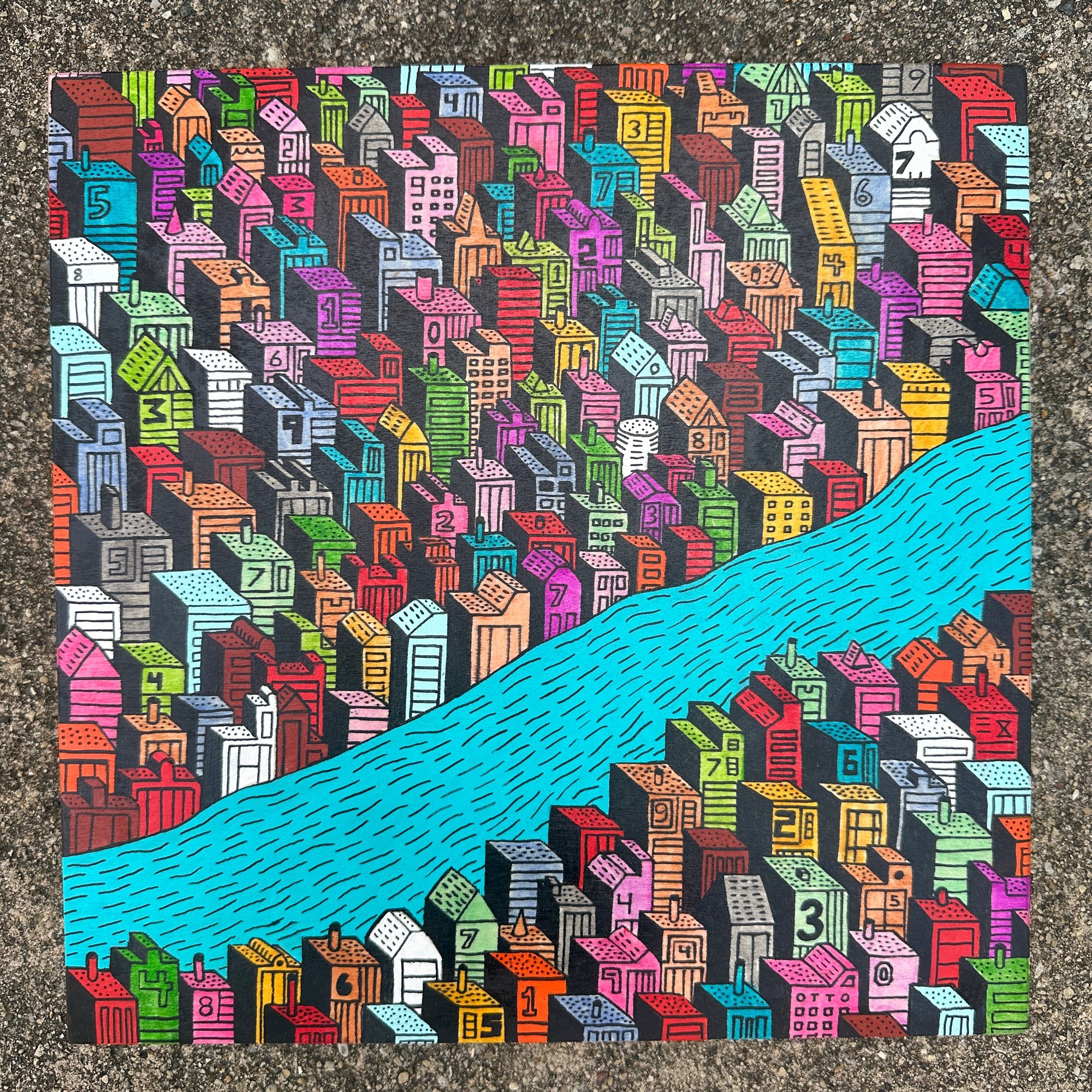12"x12" custom made wood panel. Acrylic, acrylic ink, and ink on wood. UV protectant and gloss finish. Ships free.
