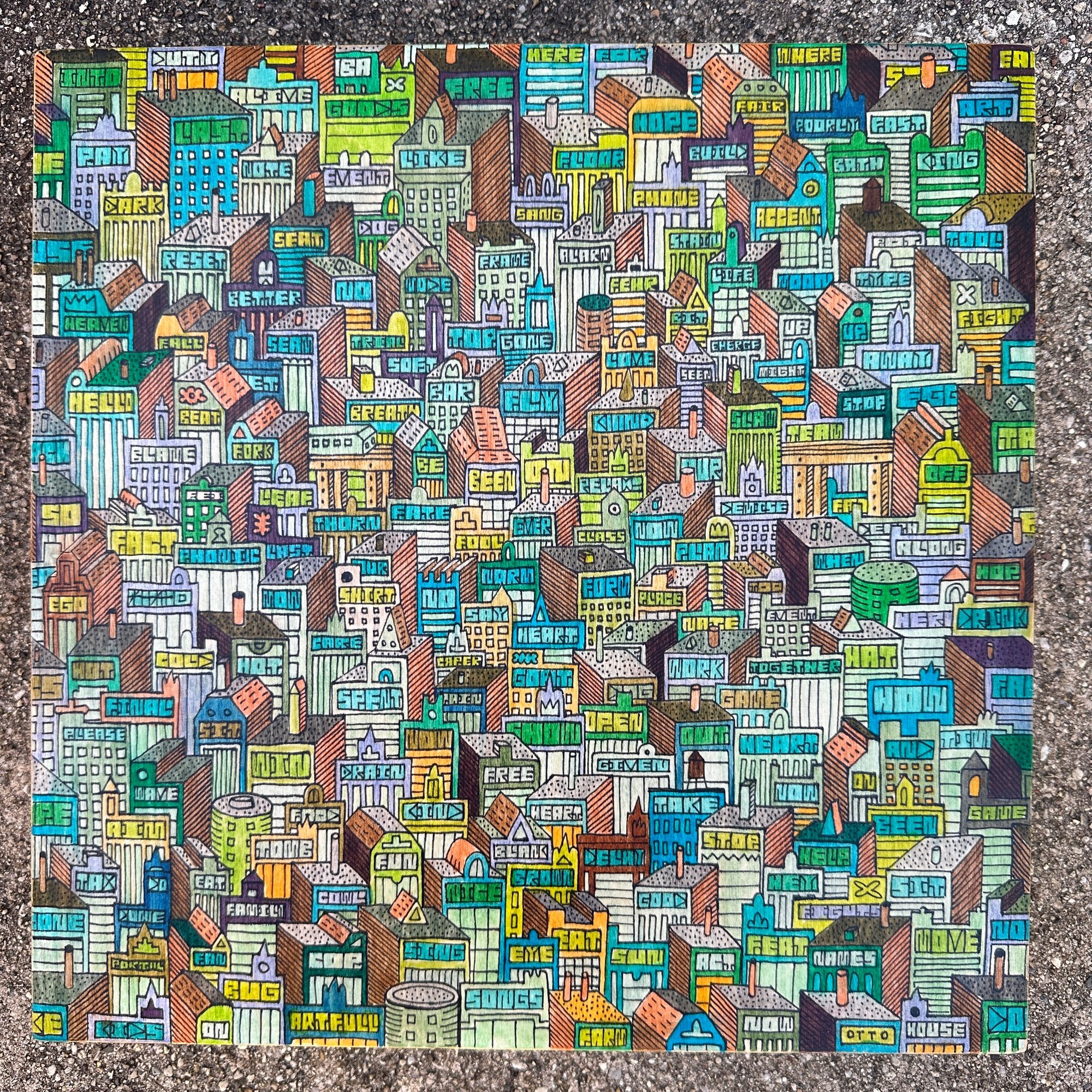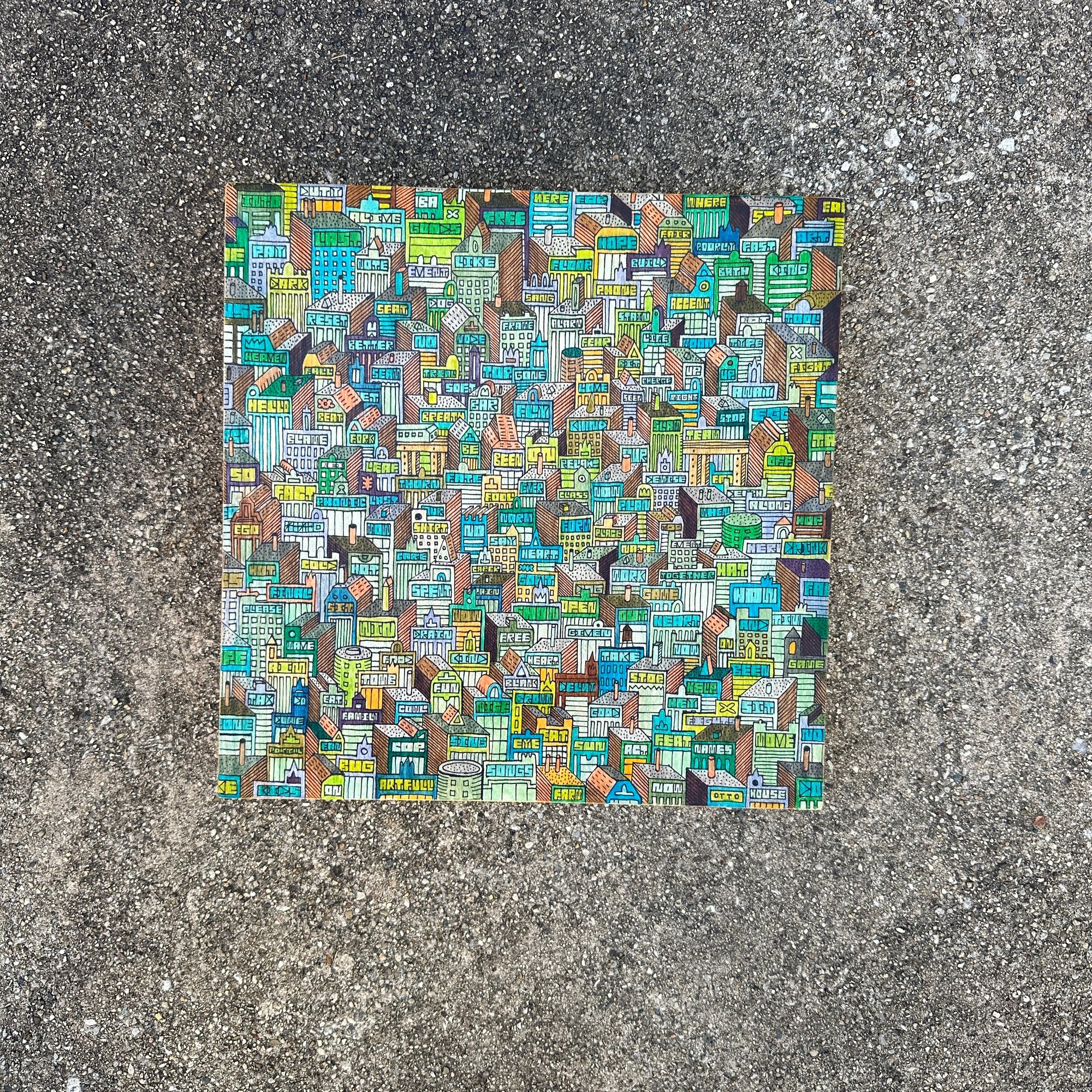 12"x12" custom made wood panel. Ink on wood. Lots of buildings and lots of words. I don't really keep track but this was definitely over 40 hours of work. Uv protectant and matte finish. Ships free.