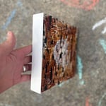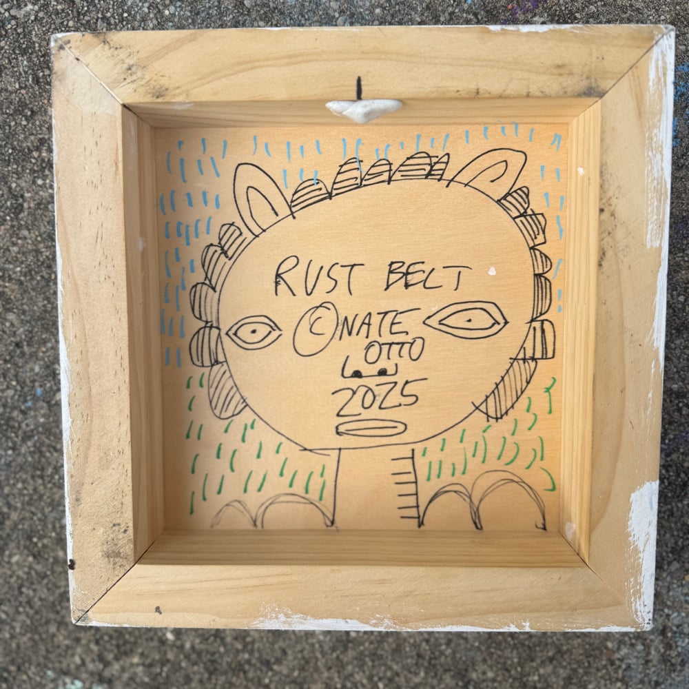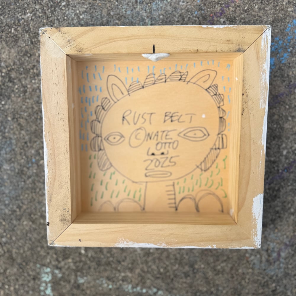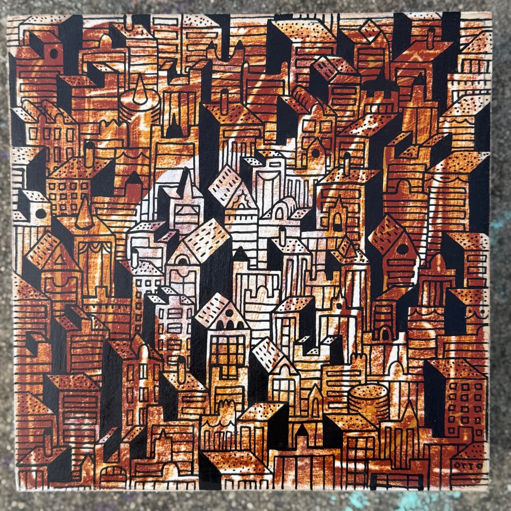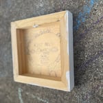 8”x8” wood panel. Four layers of acrylic sanded, and then black Posca paint marker on top. Gloss finish. The front panel was separating from the cradle in two places, so I glued it back together and then painted the sides white. I think it looks really cool and has a little bit of added texture on the sides which I think works. Then I drew a lot on the back because I felt like it. It’s a cool object and I keep picking it up and looking at it. Ready to hang. Ships free.