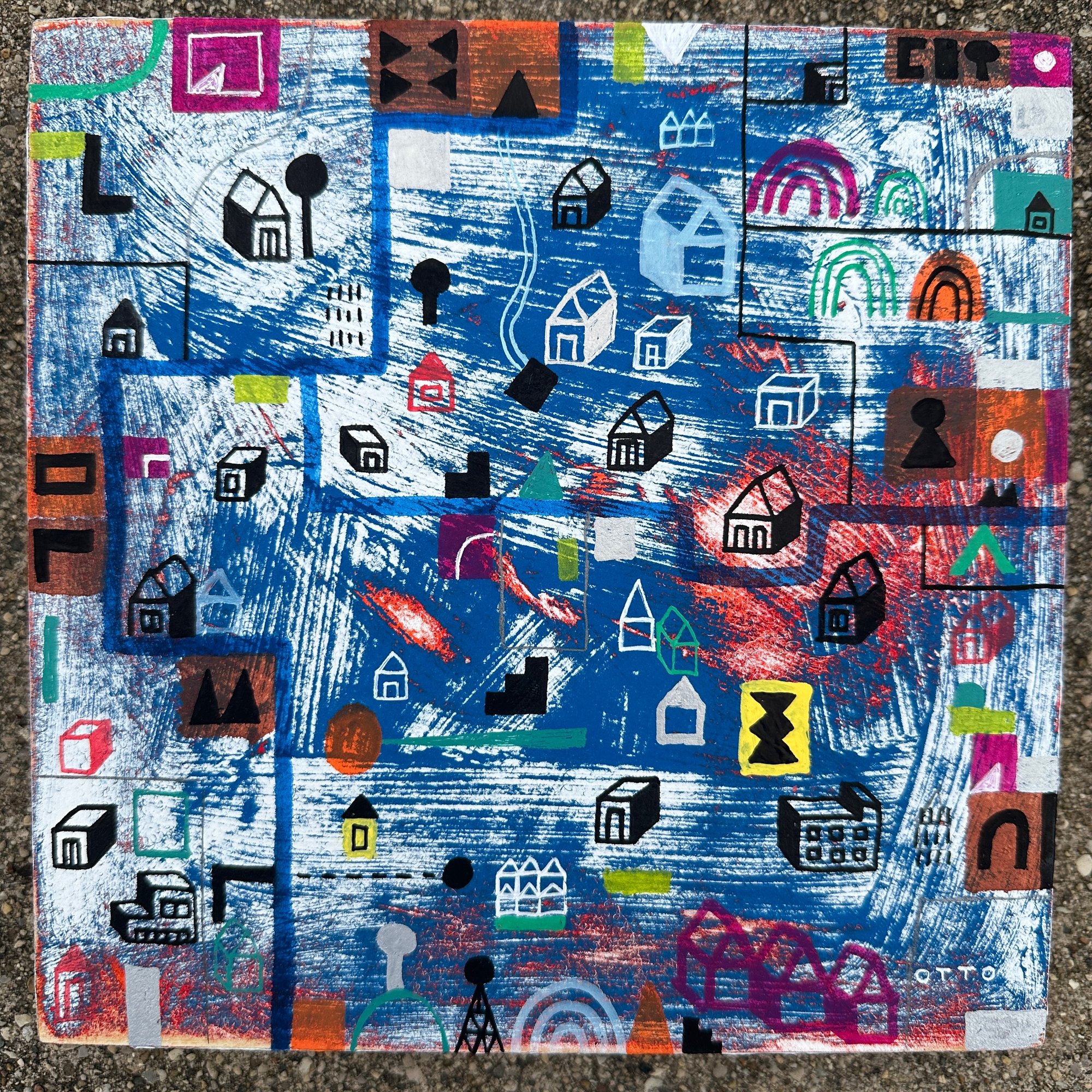8"x8" wood panel. Acrylic layers sanded, and multiple types of acrylic ink and pencil on top. Ships free.